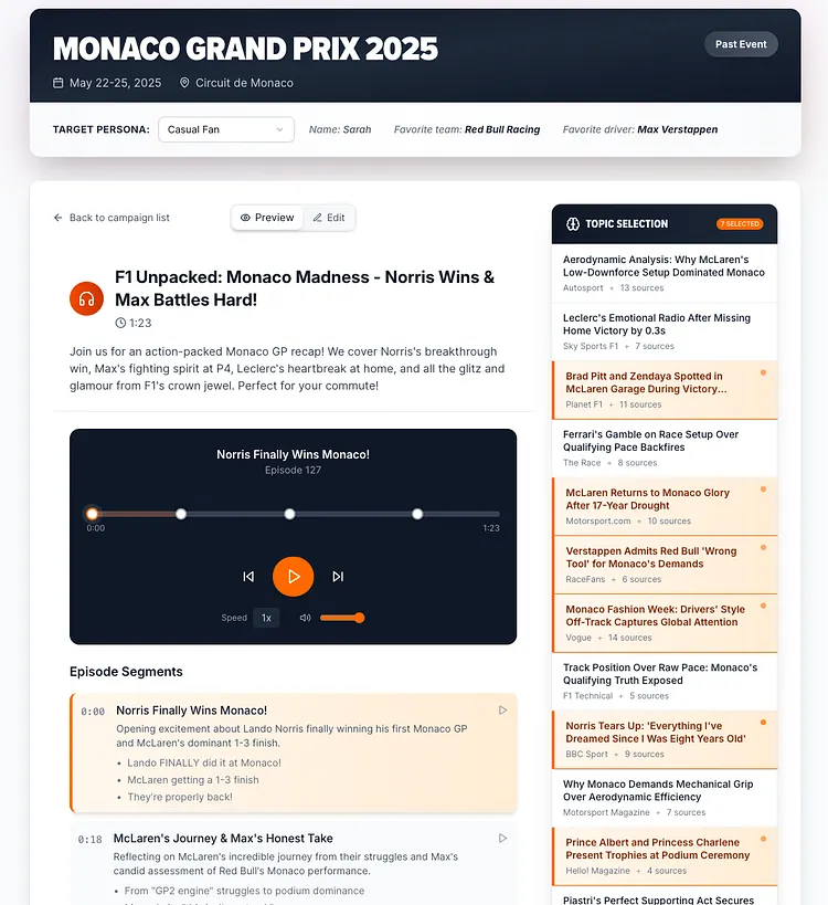 PressBox offers more than a simple episode creator. In order to truly personalize audio, you need to generate compelling, one-to-one podcasts at scale. Set a template in our Campaign Builder, and our team of agents goes to work providing rich, detailed, accurate audio content tailored to every aspect of a fan’s preferences.